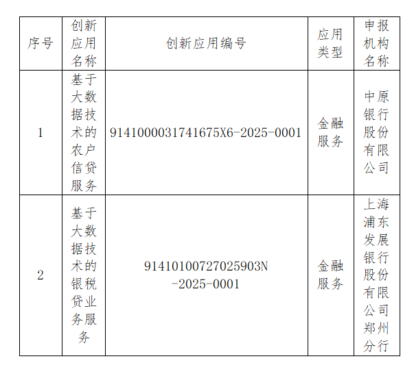 根据《中国人民银行关于发布 <金融科技创新应用测试规范> 等3项金融行业标准的通知》(银发〔2020〕249号)、《中国金融科技创新监管工具白皮书》相关要求,河南省金融科技创新监管工具(“农村数字金融”主题)新一批 金融科技创新应用测试规范>2个创新应用已完成辅导、公示等,现进入测试运行阶段,将面向用户提供服务。创新应用信息如下: